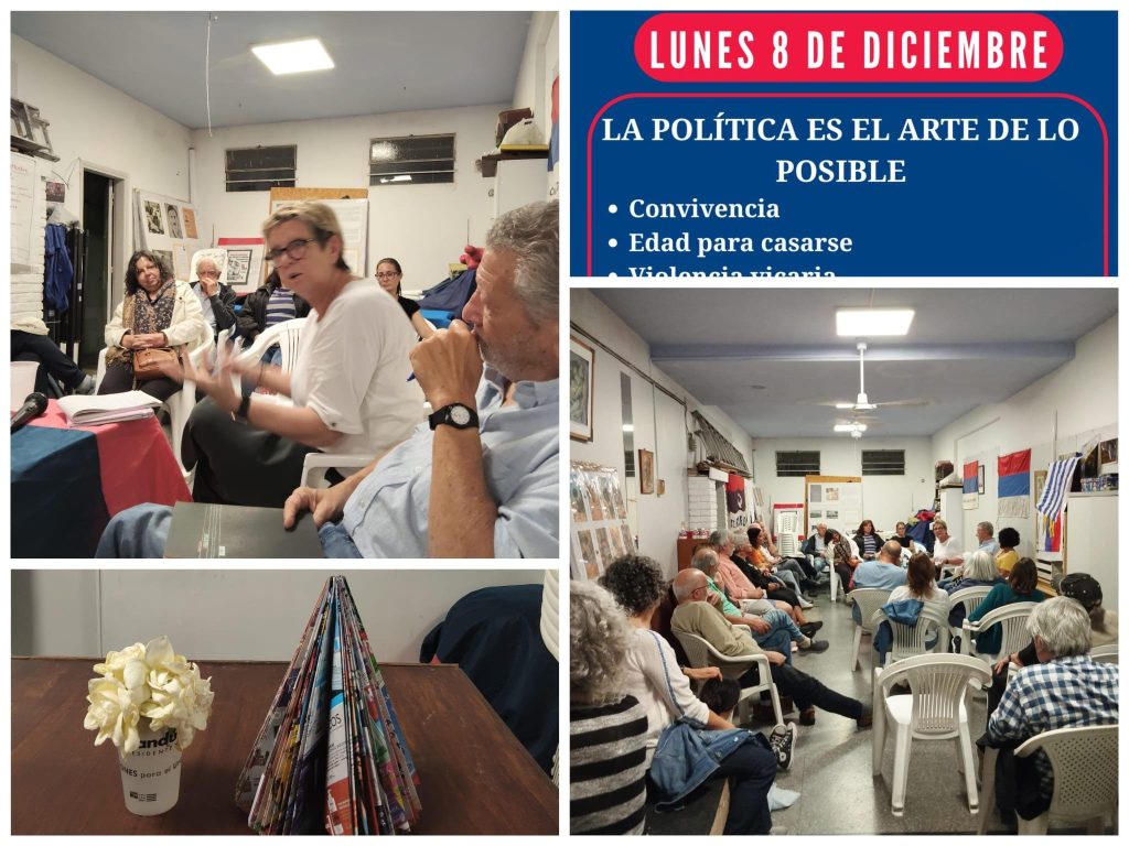 Nuestro colectivo asiste a convocatorias de diversos grupos políticos y sociales, sin adherir a ellos, más allá de las preferencias individuales de sus miembros. Está fue una de las ocasiones en que nos invitaron, el 8 de diciembre en la nochecita, a un local del Frente Amplio en Rivera esquina Colombes. En un clima de atención participante, que es el más fecundo de los climas, una veintena de frenteamplistas escucharon y preguntaron sobre dudas relacionadas con la charla dada por Alberto Curiel, de Varones por la Igualdad, y Lilián Abrazinskas, activista del feminismo y actual senadora del FA. Se habló de las nuevas problemáticas de los vínculos sociales, de la educación, de la convivencia, de la omnipresencia de la violencia en muchos ámbitos.